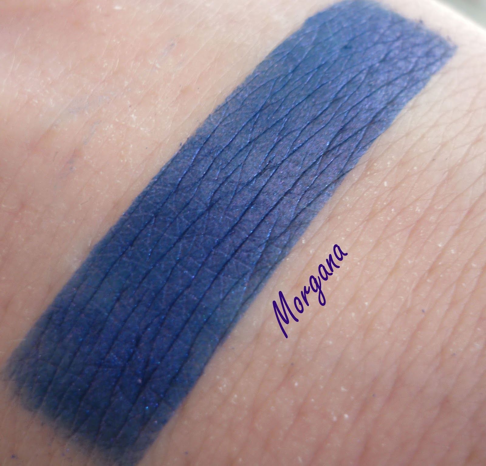 I didnt just get five samples, but SEVEN! Look at those colors! I was so excited when I saw this - I took one look and ran off to get swatching supplies.I got my jar of Morgana! And its just as amazing as I had imagined.. *drool*. If you like purple you really need to check this shade out. Onto the swatches! All are over pixie epoxy and I've used the descriptions from Notoriously Morbids' store because I dont think I could describe them better!